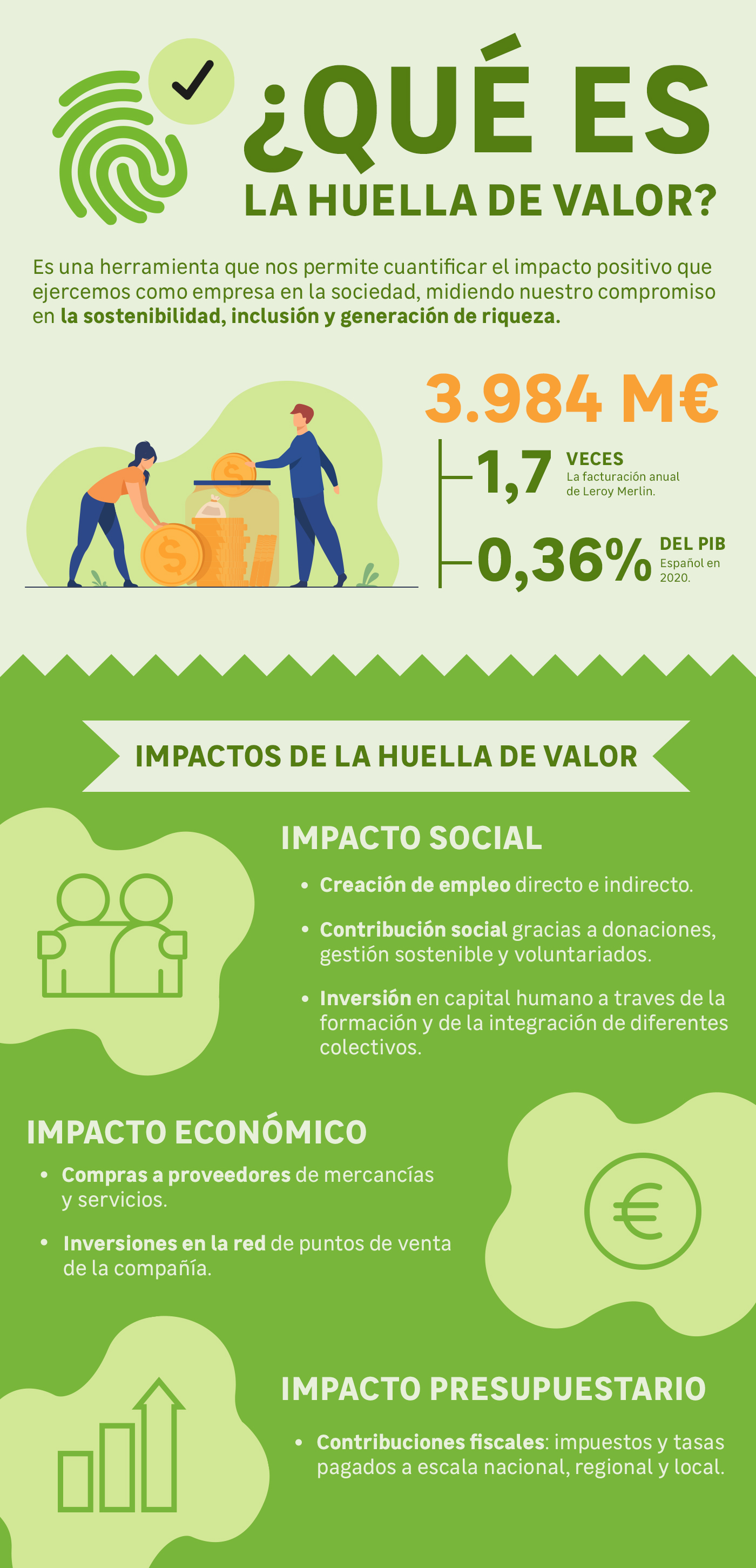 En Leroy Merlin creemos que la mejor forma de dejar huella en nuestro país es invirtiendo en él, creando un verdadero valor desde diferentes ámbitos. De esta forma, buscamos tener un impacto positivo en la sociedad generando actividad y riqueza desde estas cuatro facetas fundamentales: